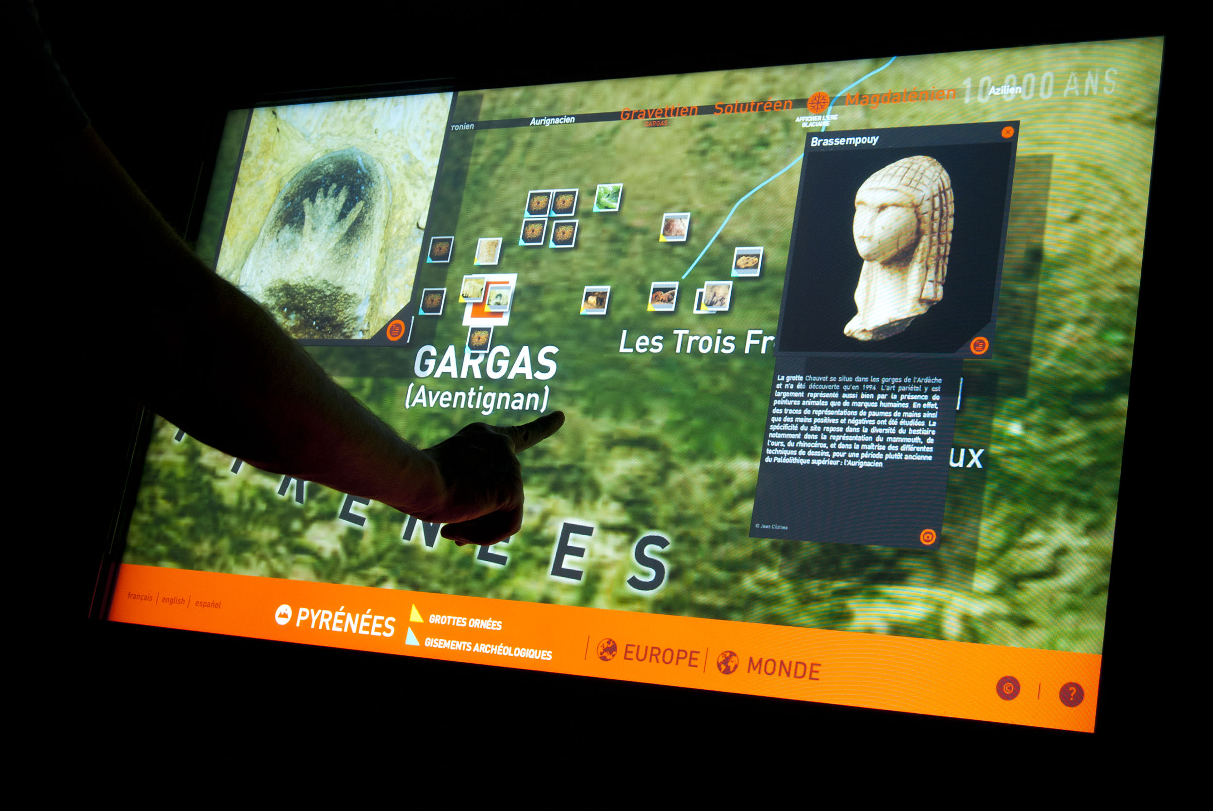 Nestploria permet de mieux “toucher” du doigt, au sens propre comme au sens figuré, le monde préhistorique de Gargas. C’est une invitation tactile et interactive à s’immerger dans la Préhistoire, découvrir des espaces inaccessibles lors de la visite, retrouver le tracé des gravures d’animaux sur la paroi, étudier le mystère des mains peintes, apprendre ce qui menace ou protège les grottes ornées, partir enfin en laissant l’empreinte virtuelle de sa main… Le contenu est proposé sous forme d’animations et de petits jeux.