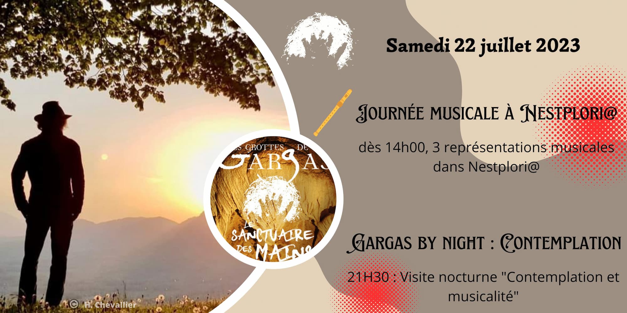 Nous accueillons ce samedi Maxence des Oiseaux, flûtiste de talent. Ses flûtes en os, en corne ou en bois, vous permettrons d'imaginer la musique au temps préhistoriques. Maxence fera trois représentations samedi après-midi dans le centre d'interprétation Nestploria et se produira lors d'une visite nocturne en soirée (visite complète).